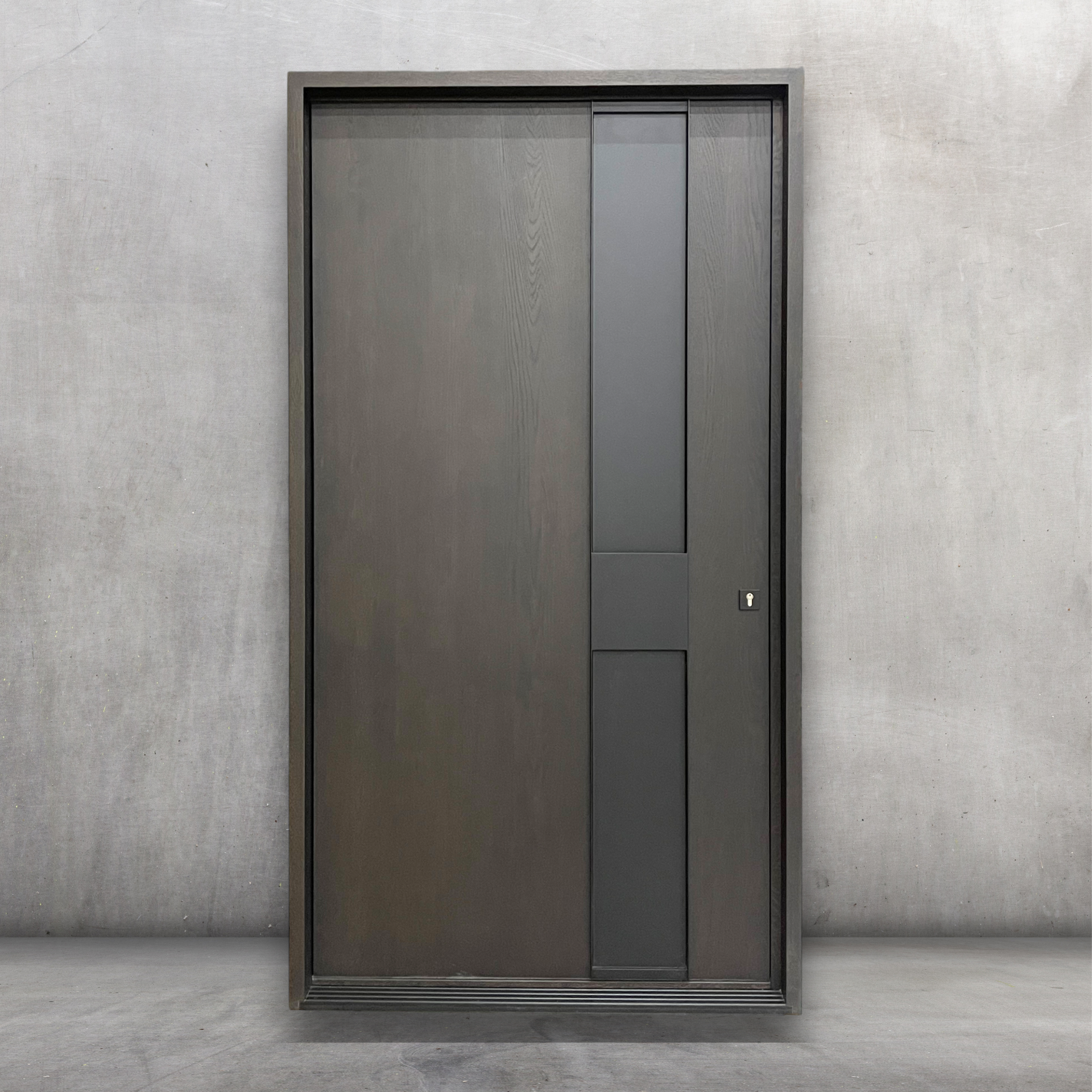 This contemporary custom exterior front door from MICHELENA stands out for its minimalist design and elegant asymmetrical composition. Made of solid wood, it features a sophisticated dark finish that highlights the natural grain of the wood while asserting a modern architectural aesthetic. Designed for Canadian climates, this door combines durability, performance and elegance, making the entrance a true design element.
